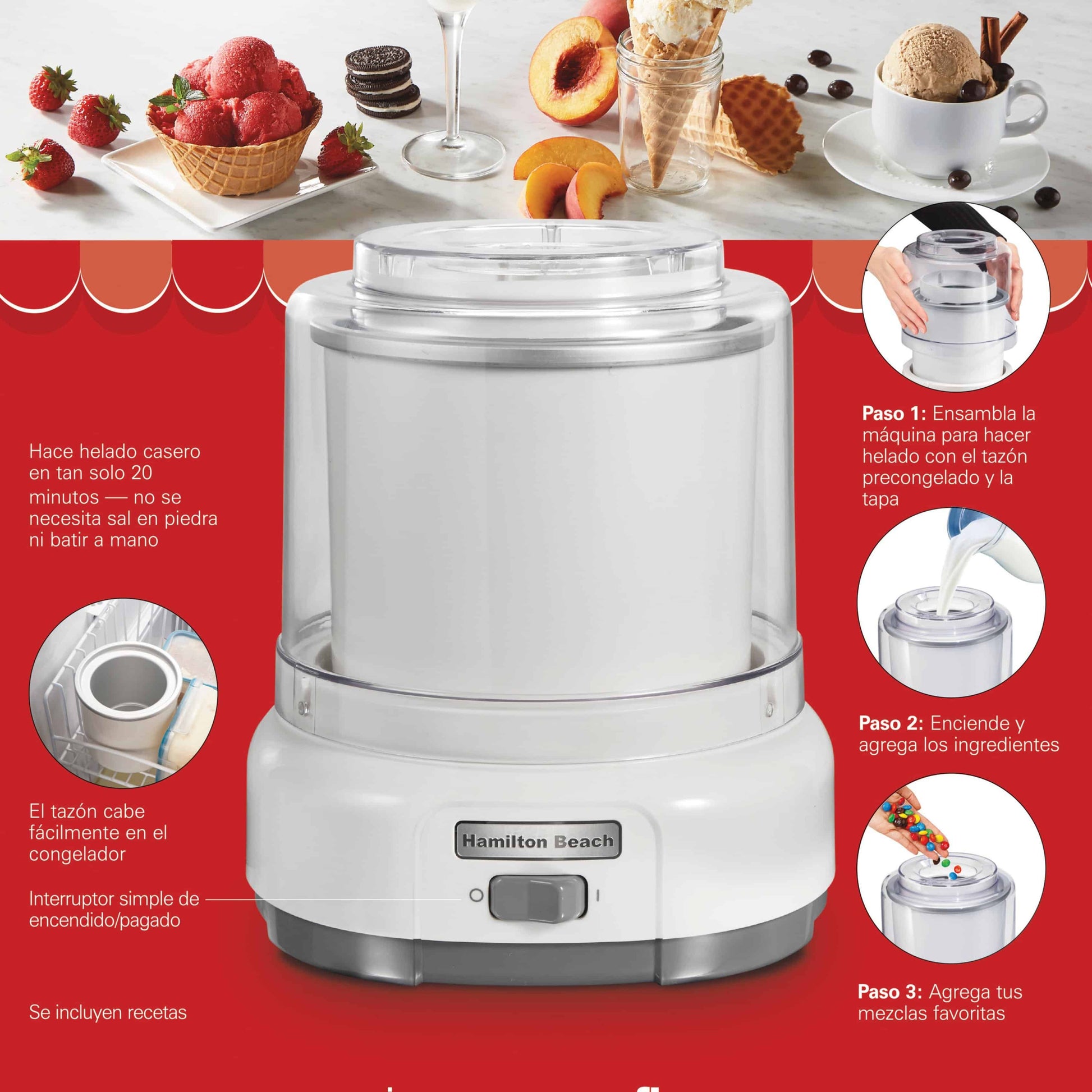 Disfruta del placer de hacer tus propios helados, sorbetes y yogur congelado en casa. Con la Máquina de Helados Hamilton Beach, solo agrega tus ingredientes favoritos, enciéndela y en 40 minutos tendrás un postre delicioso. ¡Fresco, casero y sin conservantes! 🍨✨